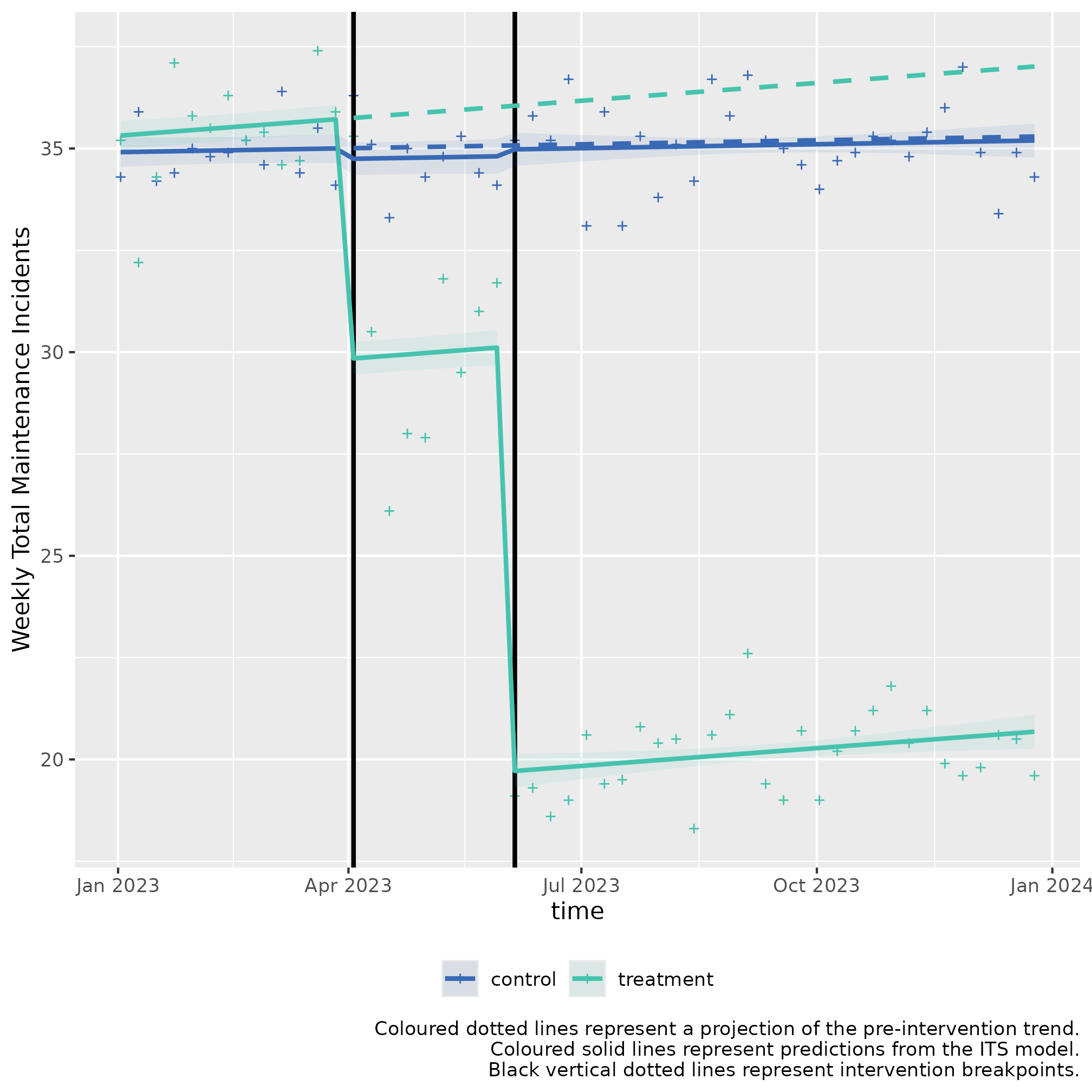 This example illustrates a scenario where each intervention leads to a significant immediate “step” decrease in the number of maintenance incidents, without slope changes.
