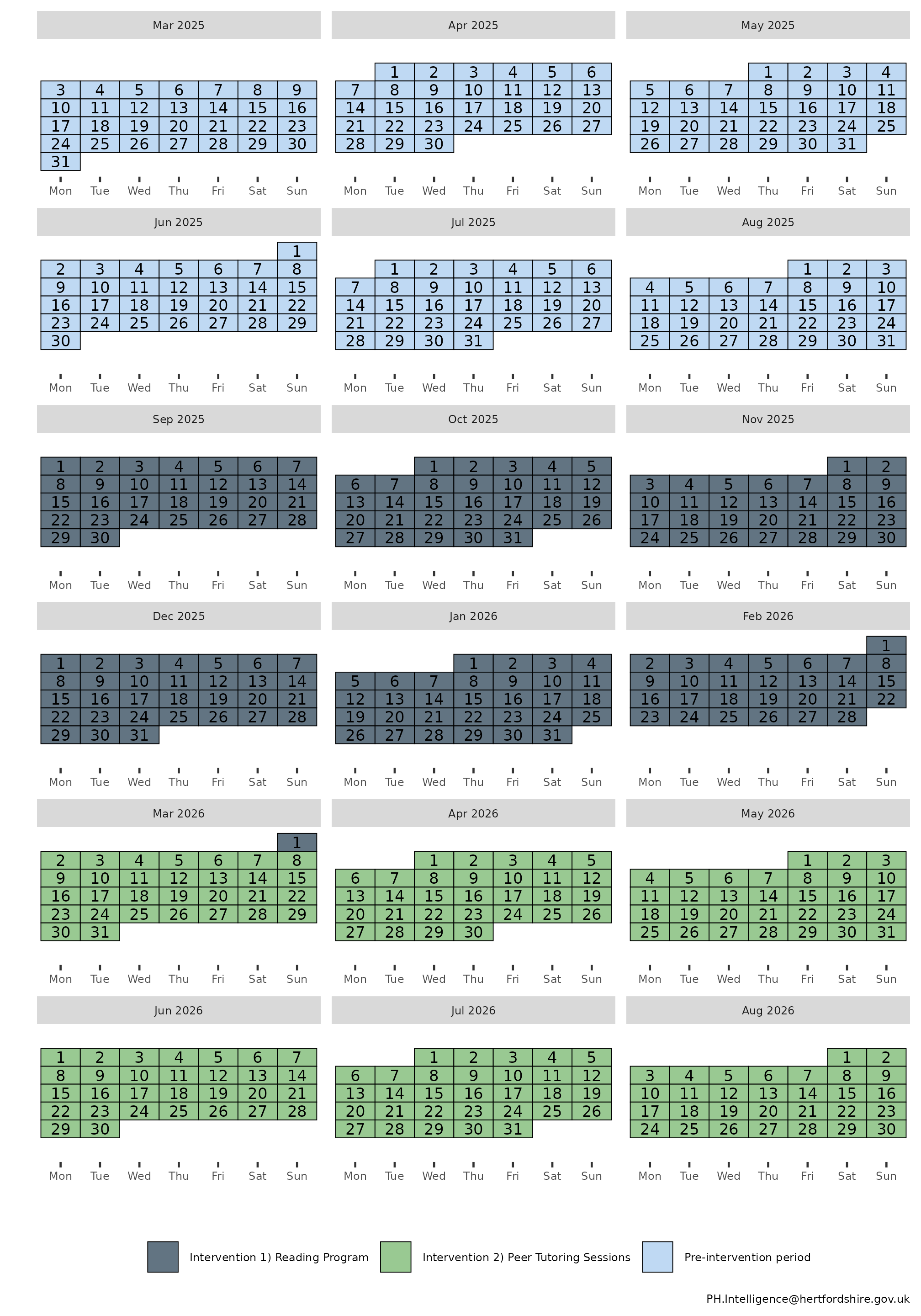 The calendar plot below summarises the timeline of the interventions:
